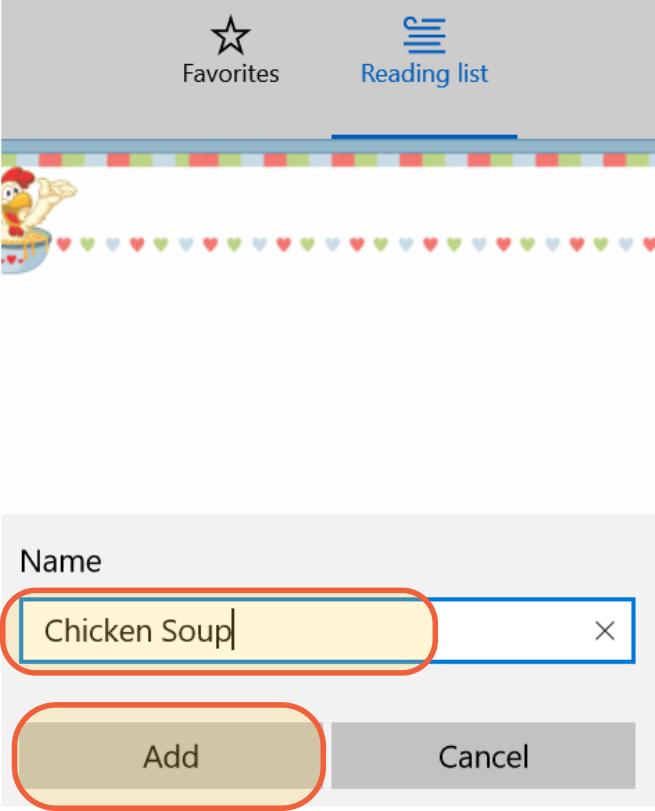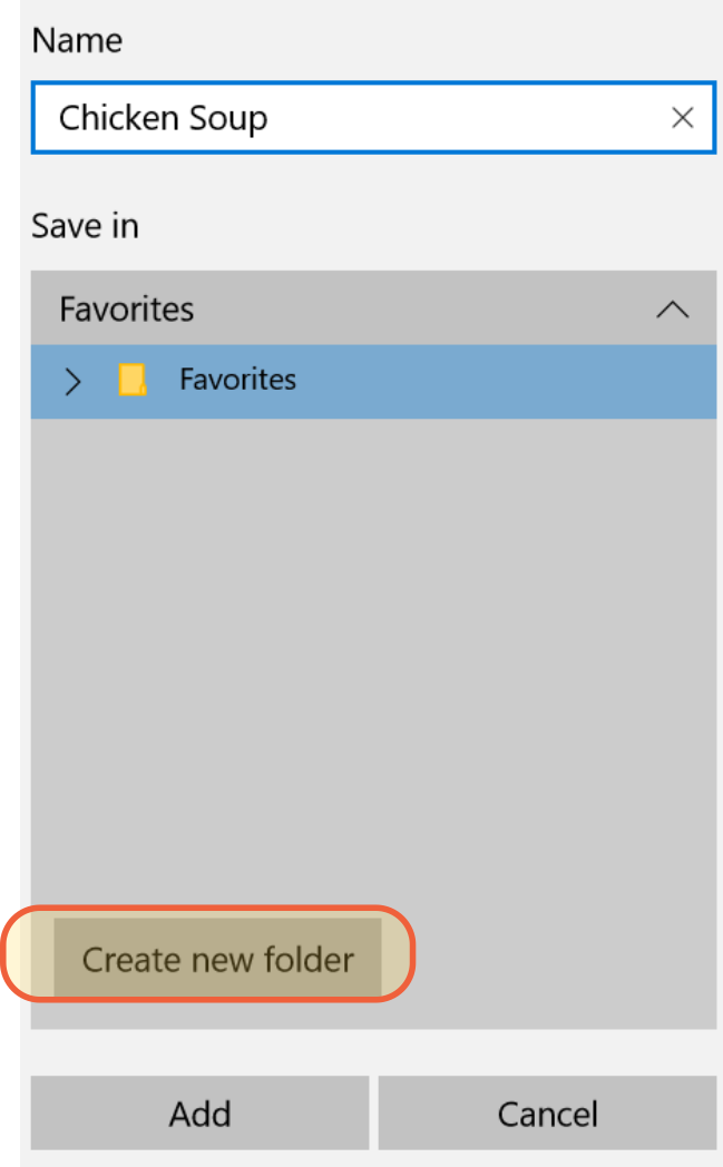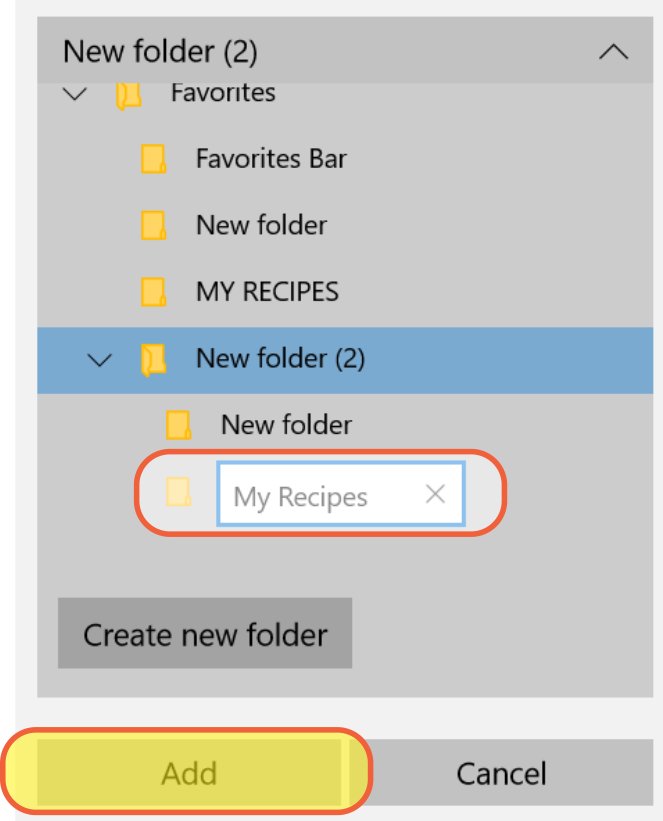 STEP 1. Click the STAR icon STEP 2. Edit your recipe title and click ADD. Organize your recipes You may want to create a folder just for your recipes and keep all of your recipes in one folder. Here's how to do this: Find your recipes Click the (It is at the end of the address bar, to the right of the page.)