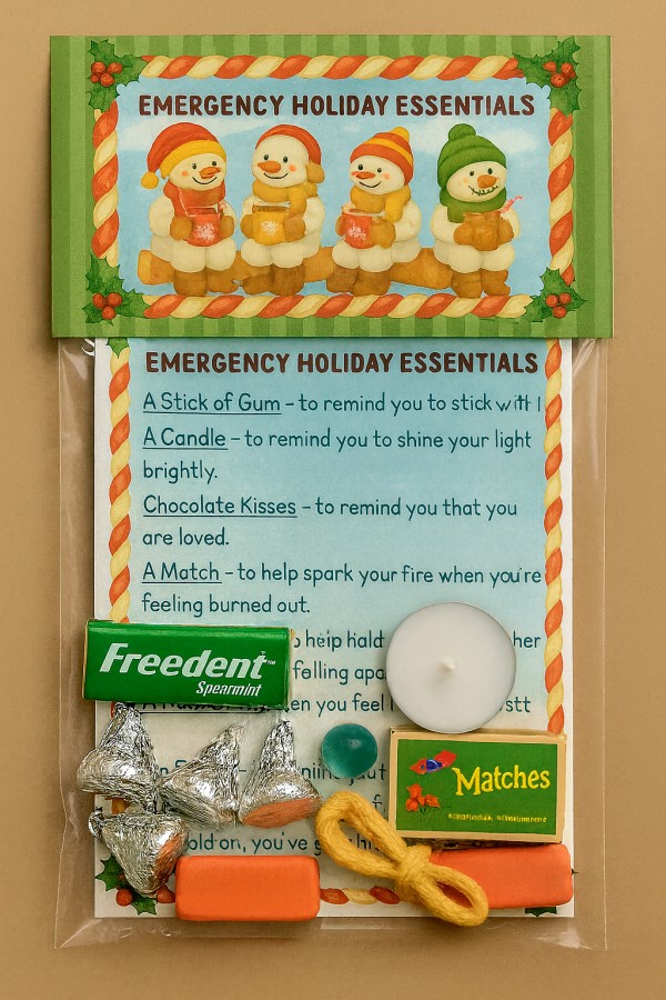 - Emergency Holiday Essentials Kit – 4" Bag Toppers: A playful mini “holiday survival kit” topper featuring symbolic items like gum, a candle, a chocolate kiss, tape, and more.