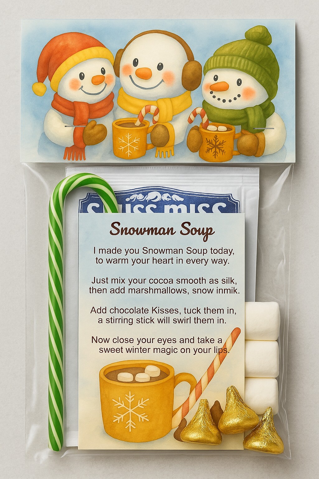 - Snowman Soup Kit (with poem): A cute cocoa-themed gift bag project with a poem card and a topper sized for a 6"×4" bag.